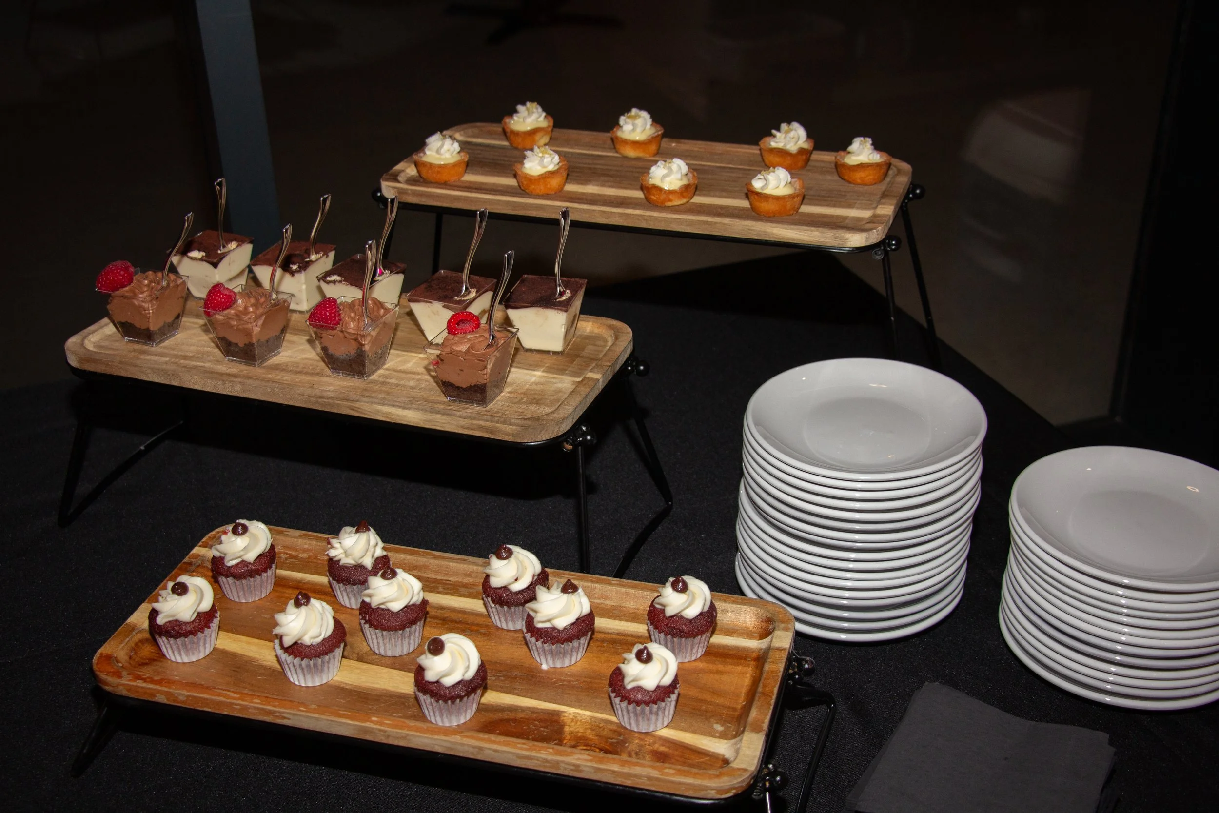 Cheesecake shooters, mousse cups, macarons, mini cupcakes, fruit tarts, and silky panna cotta. Perfect for grazing and photo-worthy bites.